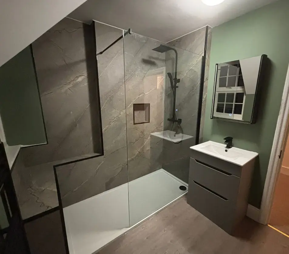 Modern Walk-In Shower Bathroom with Wall Panels At DSB Bathrooms, we specialise in transforming outdated bathrooms into stylish, functional spaces designed for modern living. This