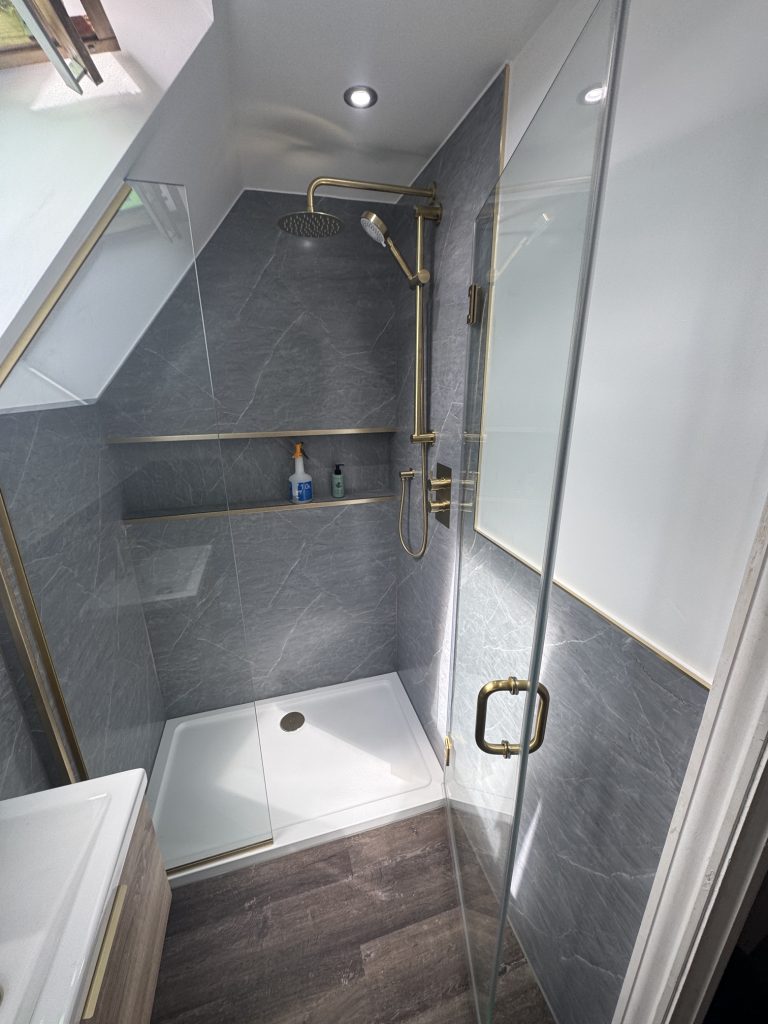 Bathroom Transformation: From Dated Family Bath to Modern Black & Marble Affect Shower Room Project Overview This recent bathroom renovation project was completed over 8